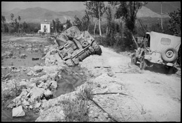Tank in the ruins of Cassino, Italy. Photograph taken after 25 March 1944, from the convent attached to Chiesa del Carmine (church) on Route 6 inside Cassino. Photographer unidentified, possibly J V Macfarlane.