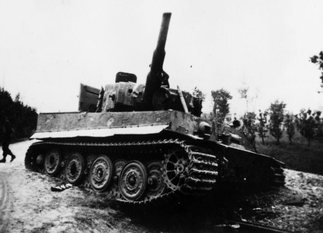 Caption on file print reads: ‘This NZ Sherman tank was knocked out by the German Tiger [tank], which was destroyed in turn by a ‘stonk’ from the guns of NZ Div Arty.’ Photograph taken circa 4 August 1944 by George Frederick Kaye.
